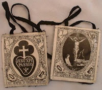 "The scapular (from Latin, scapula, shoulder) forms a part, and now the most important part, of the habit of the monastic orders. The small scapulars consist essentially of two quadrilateral segments of woolen cloth (about two and three-quarter inches long by two inches wide), connected with each other by two strings or bands in such a manner that, when the bands rest on the shoulders, the front segment rests before the breast, while the other hangs down an equal distance at the back."